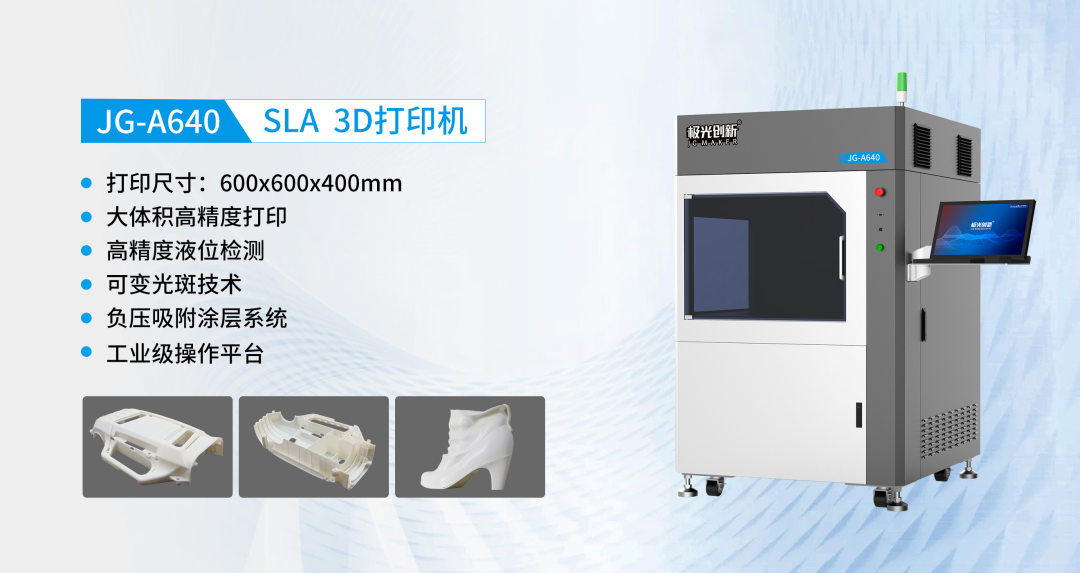 在展位上宣傳展示的一系列產(chǎn)品中,極光創(chuàng)新王牌級(jí)產(chǎn)品JG-A640工業(yè)級(jí)光固化3D打印機(jī)當(dāng)仁不讓占領(lǐng)C位,JG-A640依據(jù)其大體積、高精度、低成本的特點(diǎn),更大限度的提高了生產(chǎn)率和靈活度,高達(dá)0.05m的精度等級(jí),可制作各種結(jié)構(gòu)復(fù)雜的精密零件和組裝件。