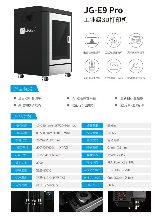 極光創(chuàng)新JG-E9 Pro作為極光創(chuàng)新工業(yè)級FDM系列3D打印機(jī)的王牌產(chǎn)品,在教育科研、工業(yè)制造等領(lǐng)域深受好評,除了擁有500*400*600mm的較大成型尺寸之外,全封閉空間的鈑金結(jié)構(gòu)機(jī)身,不僅可以很好的控制機(jī)箱溫度,有效提升打印精度。同時(shí),該款機(jī)器的內(nèi)置配置也是直接拉滿,集成化設(shè)備管理系統(tǒng)、先進(jìn)的熱感控制系統(tǒng)、四軸靜音驅(qū)動(dòng)主板、大流量高散熱蚊子噴頭等齊全的內(nèi)核配置,全方位保障3D打印模型的成型率。